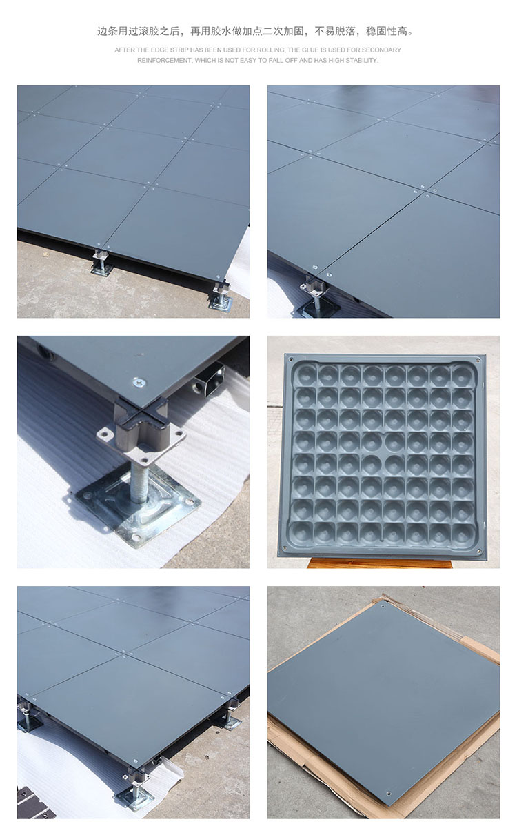 該地板可以選配帶出線口的配置,可根據要求任意添加線槽布線更具靈活性。此地板可以將強、弱電分開隔離,同時也便于檢修。安裝采用無梁角鎖,具有牢靠、穩定、調平、簡便之特點。