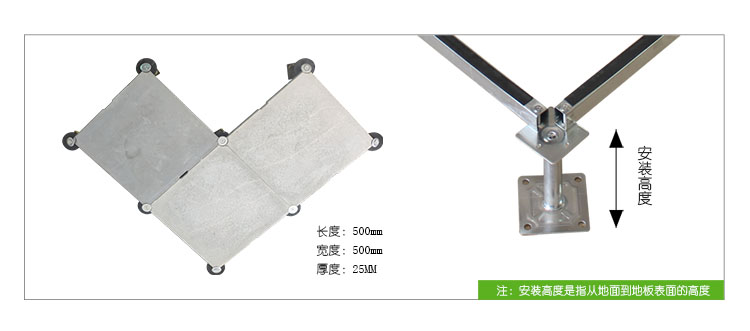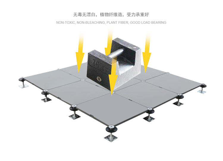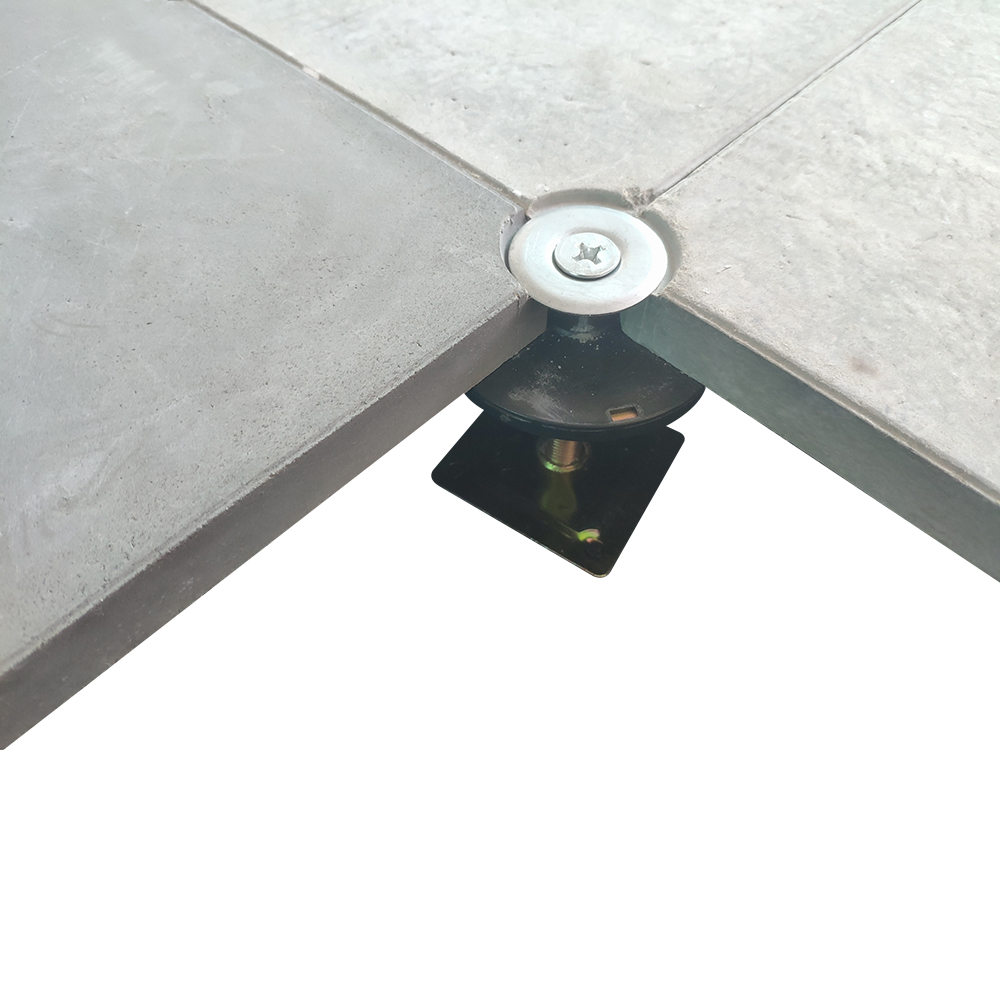 GRC水泥地板是由硅酸鹽、無機纖維、礦物纖維、石英砂等材料經過高壓一次成型的環(huán)保地板,每塊地板自帶穿線孔。地板四角鍍鋅底座支承,不帶橫梁系統。每塊地板四角有90度圓弧,四塊板組合而成后形成一個圓,有一個鐵制螺母壓角固定。鋁頭上配有圓形緩沖定位橡膠墊,防止地板受力后顫動引起的響聲。支架高度可調5cm。